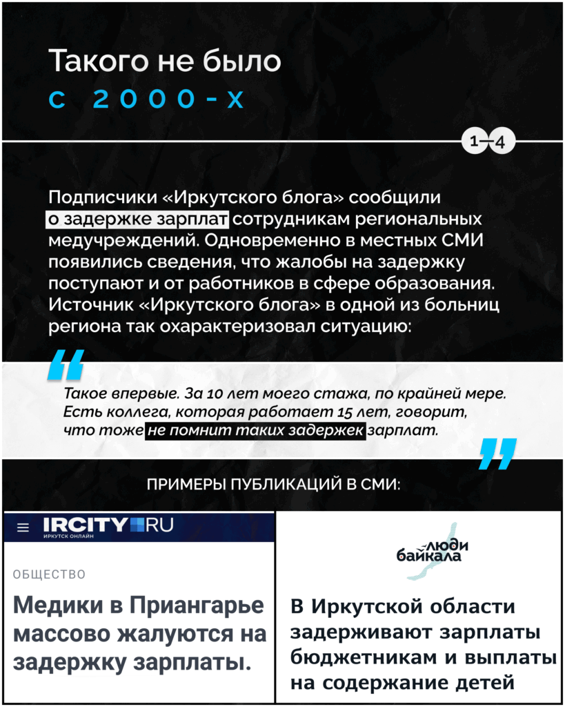 Подписчики «Иркутского блога» сообщили о задержках зарплат сотрудникам региональных медицинских учреждений. Одновременно в местных СМИ появились сообщения, что жалобы поступают и от работников сферы образования. Источник «Иркутского блога» в одной из больниц региона так охарактеризовал ситуацию: