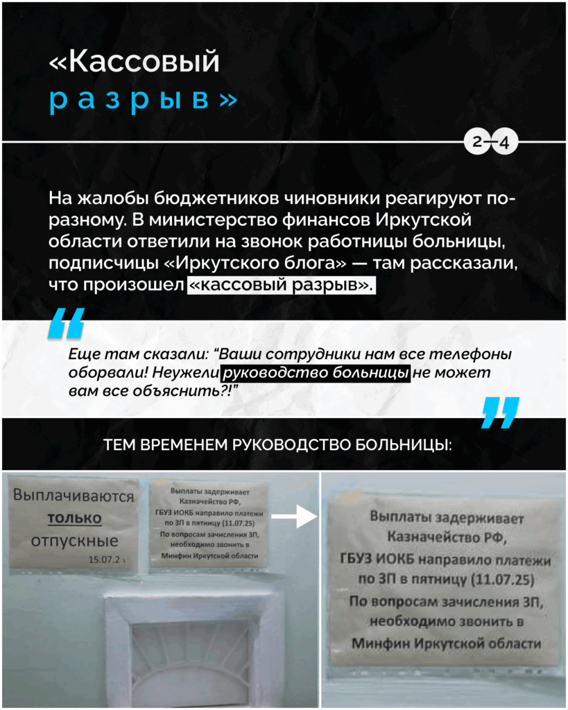 На жалобы бюджетников чиновники реагируют по-разному. Так, в министерстве финансов Иркутской области на звонок работницы больницы, подписчицы «Иркутского блога», ответили, что произошёл «кассовый разрыв».