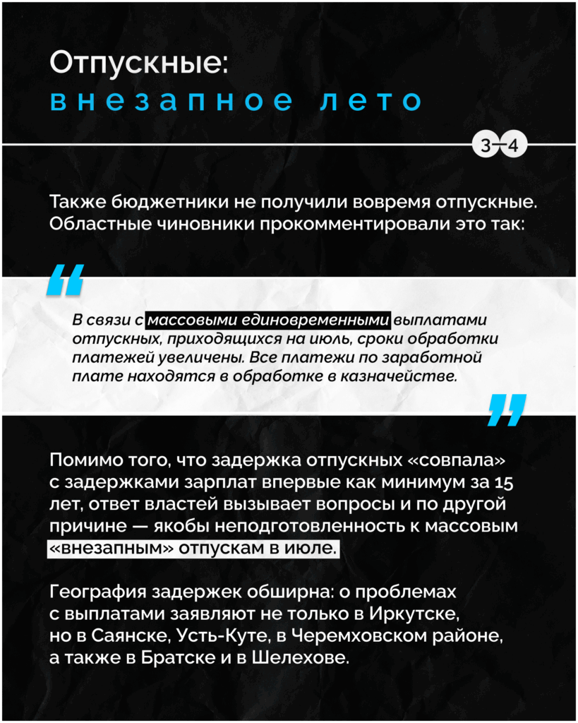 География задержек обширна: о проблемах с выплатами заявляют не только в Иркутске, но и в Саянске, Усть-Куте, Черемховском районе, а также в Братске и Шелехове.