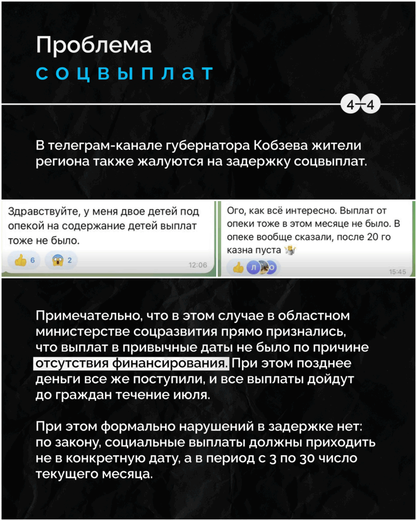 В телеграм-канале губернатора Кобзева жители региона также жалуются на задержки социальных выплат.