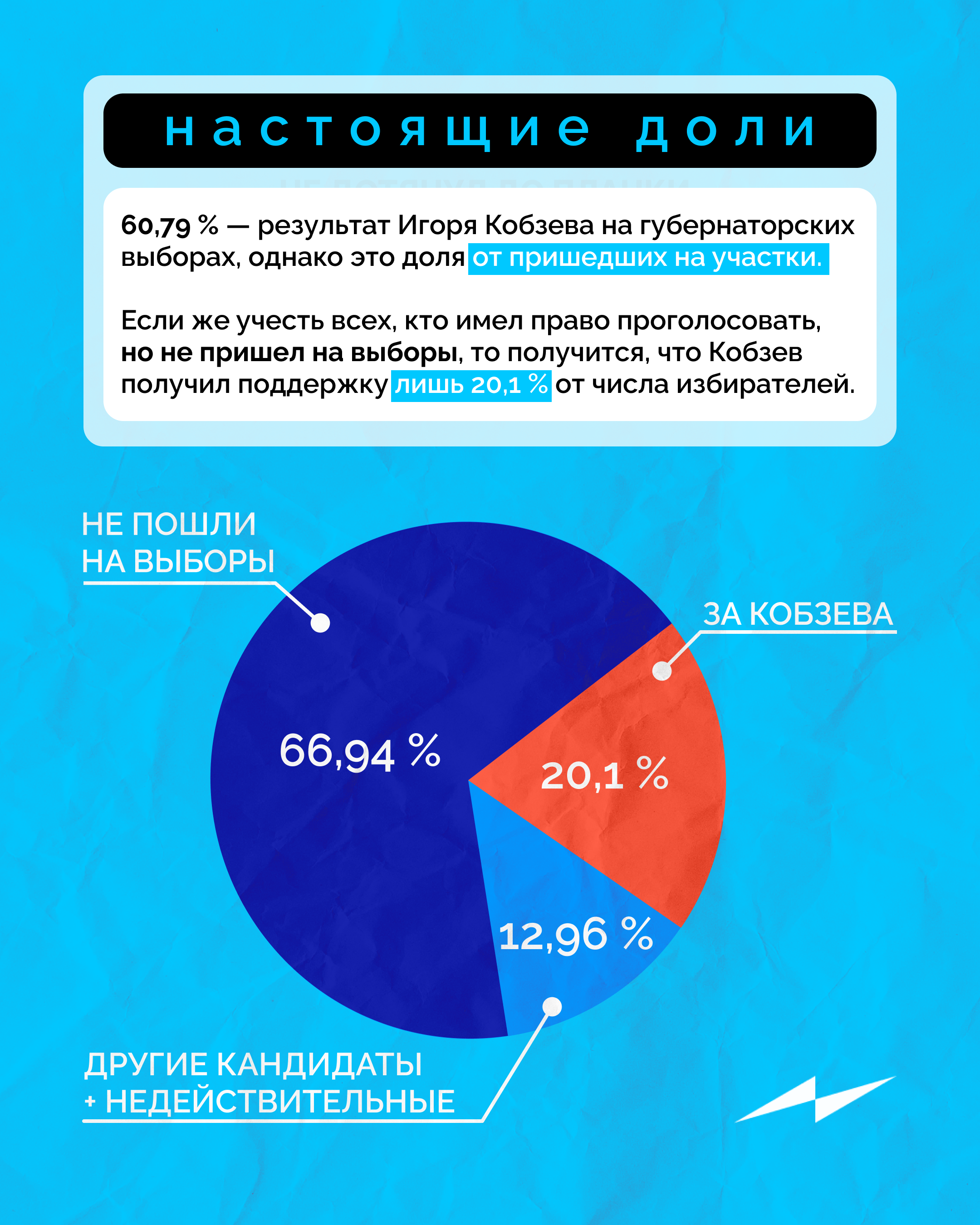 Таким образом, Кобзева выбрали губернатором… всего 20,1 % избирателей. Четыре пятых за него не голосовали. Почти 67% на выборы просто не пошли.