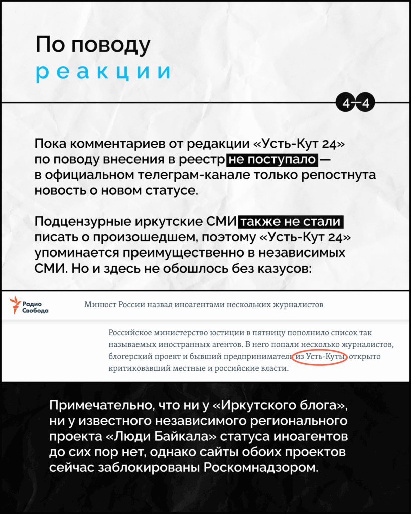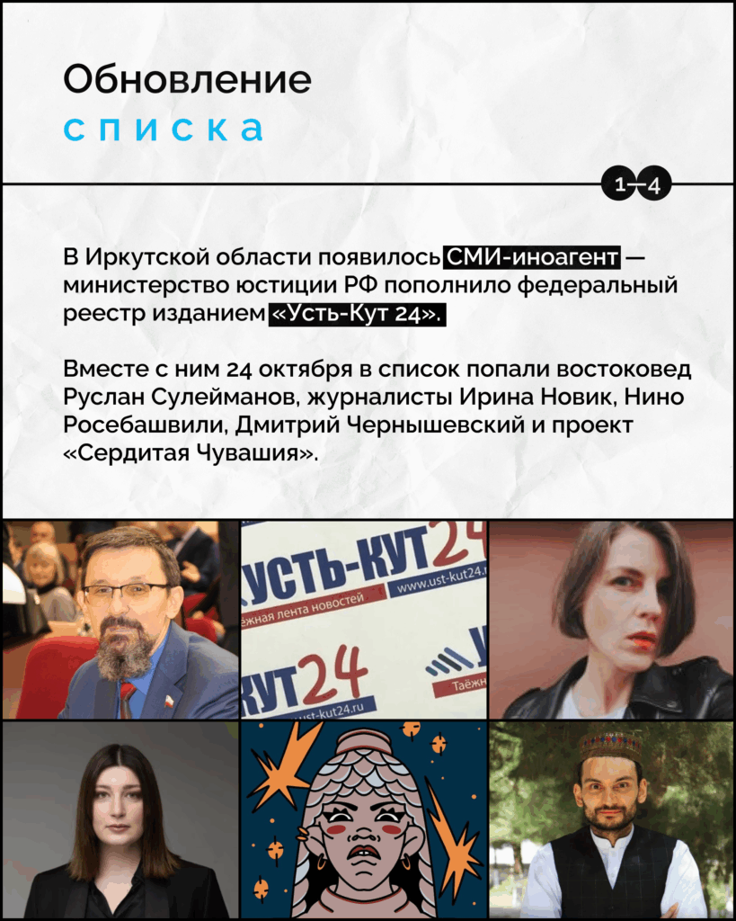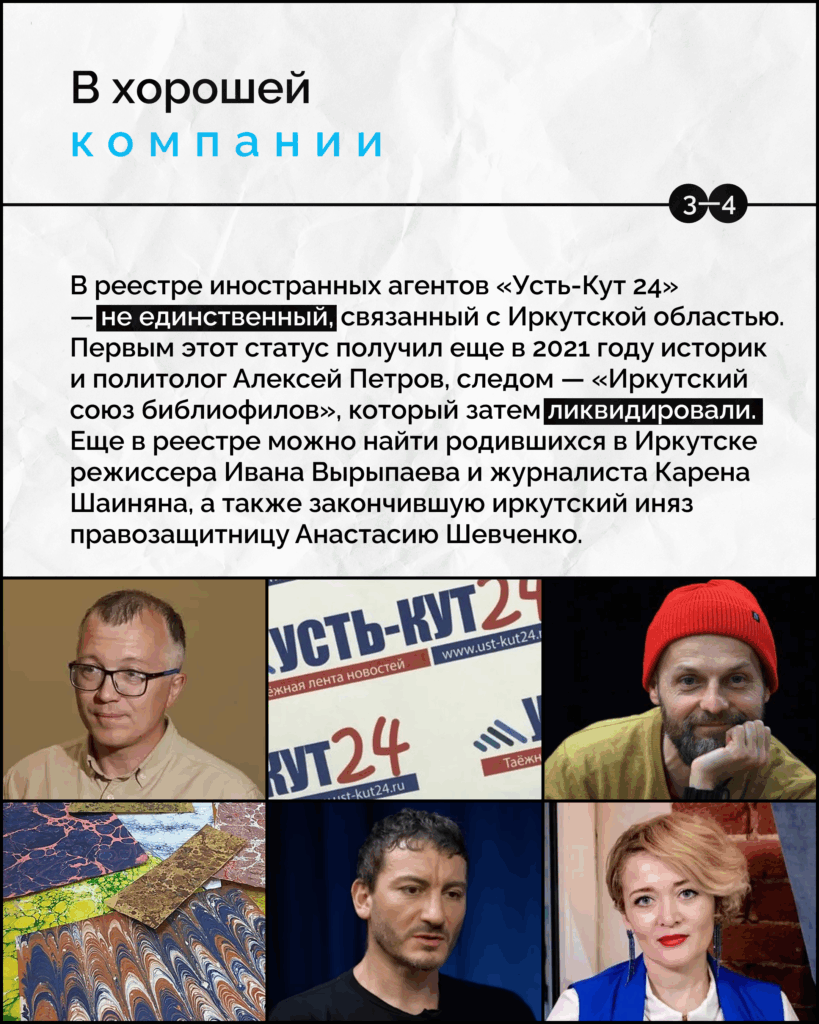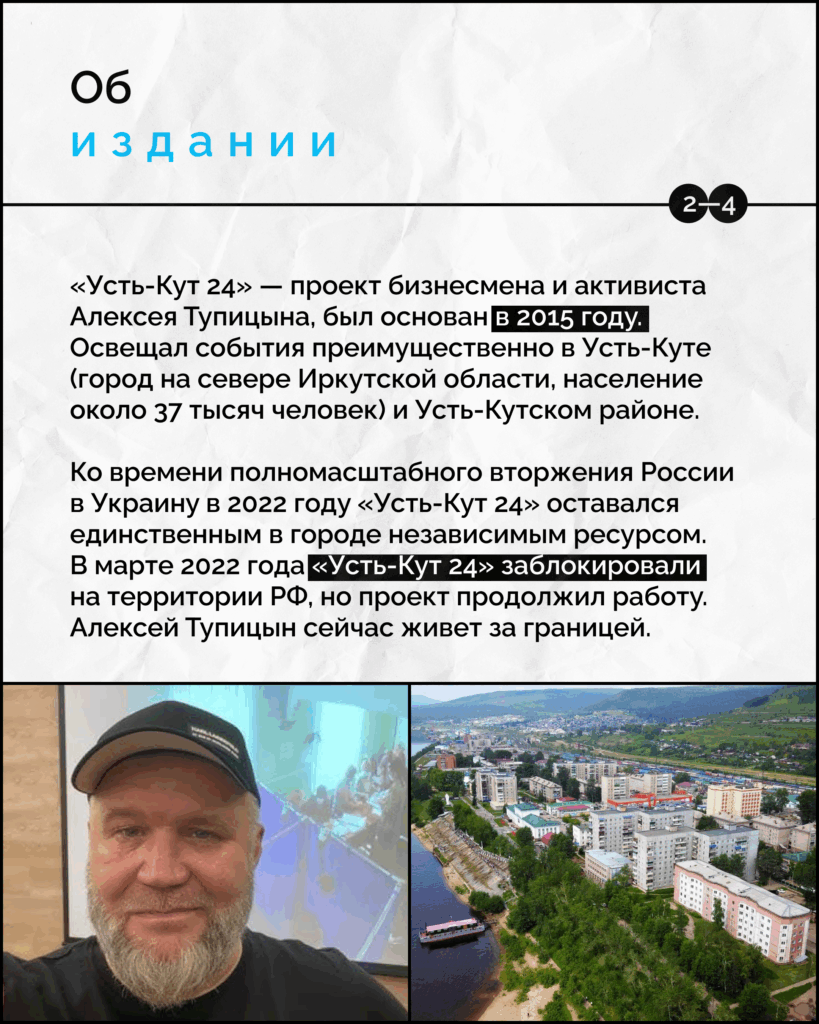 Независимое издание из небольшого города Усть-Кут на севере Иркутской области признали СМИ-иностранным агентом. Подробности — в карточках.