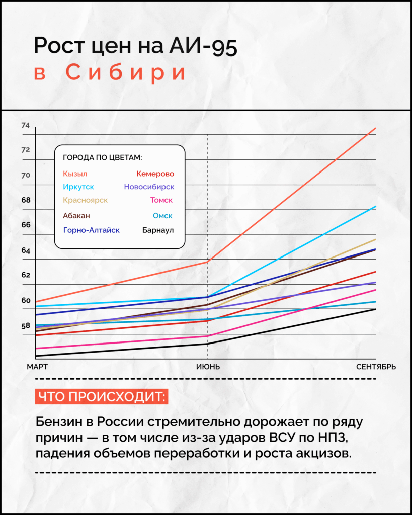 На графике ниже представлена динамика роста цен на бензин АИ-95 на заправках главных городов Сибирского федерального округа. Иркутск в сентябре занял второе место, лидером оказался центр Республики Тыва Кызыл.