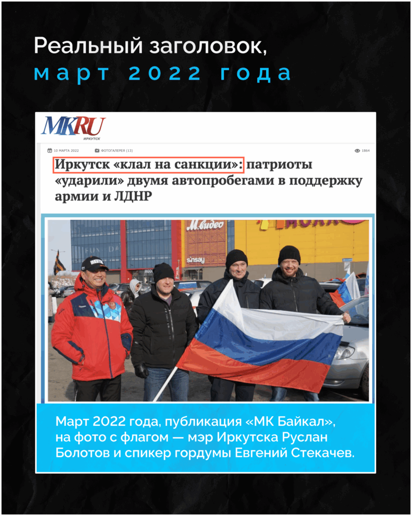 Тем временем «Иркутский блог» вспоминает заголовок материала региональной редакции «Московского комсомольца» начала 2022 года: тогда власти транслировали тезис, что «Иркутск кладет на санкции».