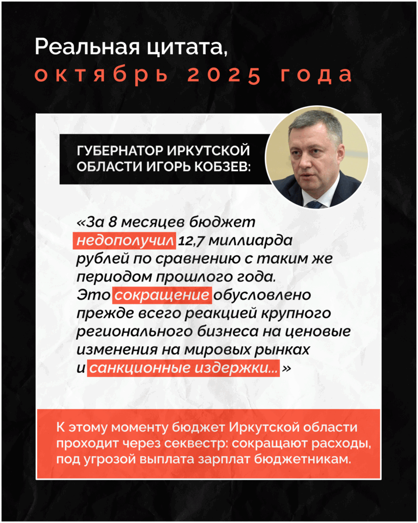 В ходе обсуждения секвестра бюджета Иркутской области губернатор Игорь Кобзев признал, что доходы значительно упали в том числе из-за санкционной политики в отношение России. В результате теперь бюджетники в декабре 2025 года не получат зарплату вовремя.