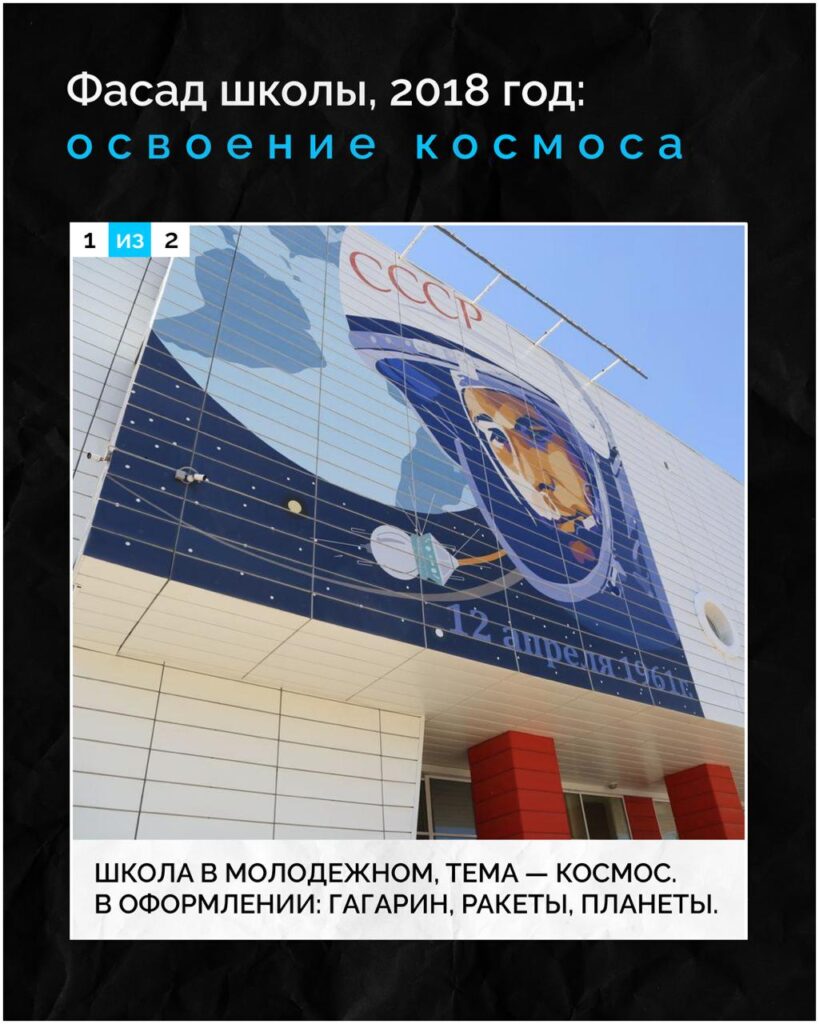 2018: новая школа в Молодежном, на фасаде — тема освоения космоса: там Гагарин, ракета «Ангара» и планеты.