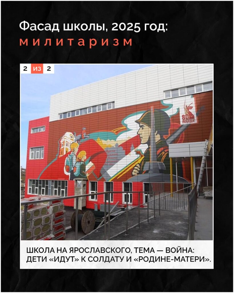 2025: достраивают новую школу на Ярославского. Аналогичный проект, но тема фасада — война. Направляющие линии композиции «ведут» детей к фигуре военного.