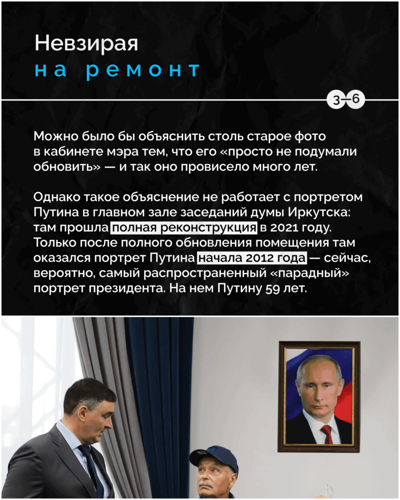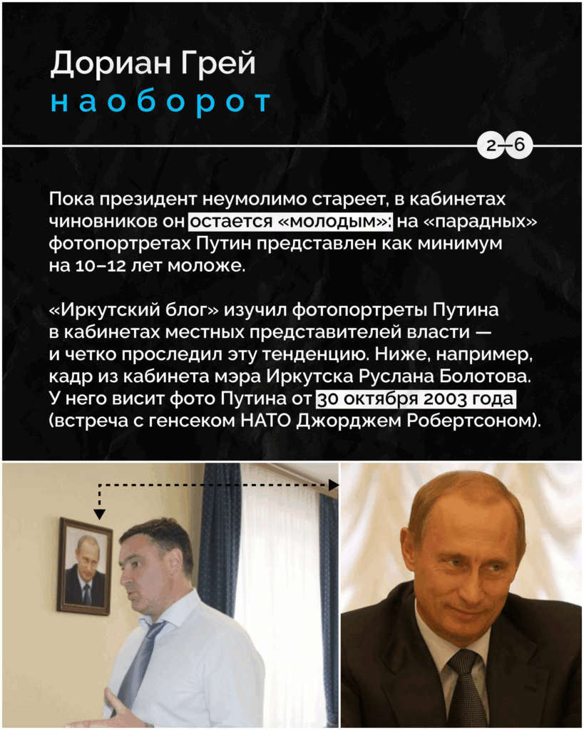 Однако вот в иркутских высоких кабинетах вы столь пожилого президента не увидите — создается впечатление, что власти намеренно поддерживают его «вечно молодым». Подробности — в карточках.