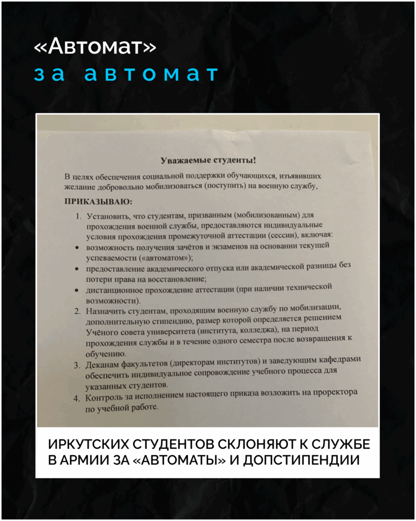 Для иркутских студентов Юридического института ИГУ создают особые условия, чтобы стимулировать их к отправке на службу в армию. Фотографию объявления, распространенного по чатам студенческих групп, прислал подписчик.