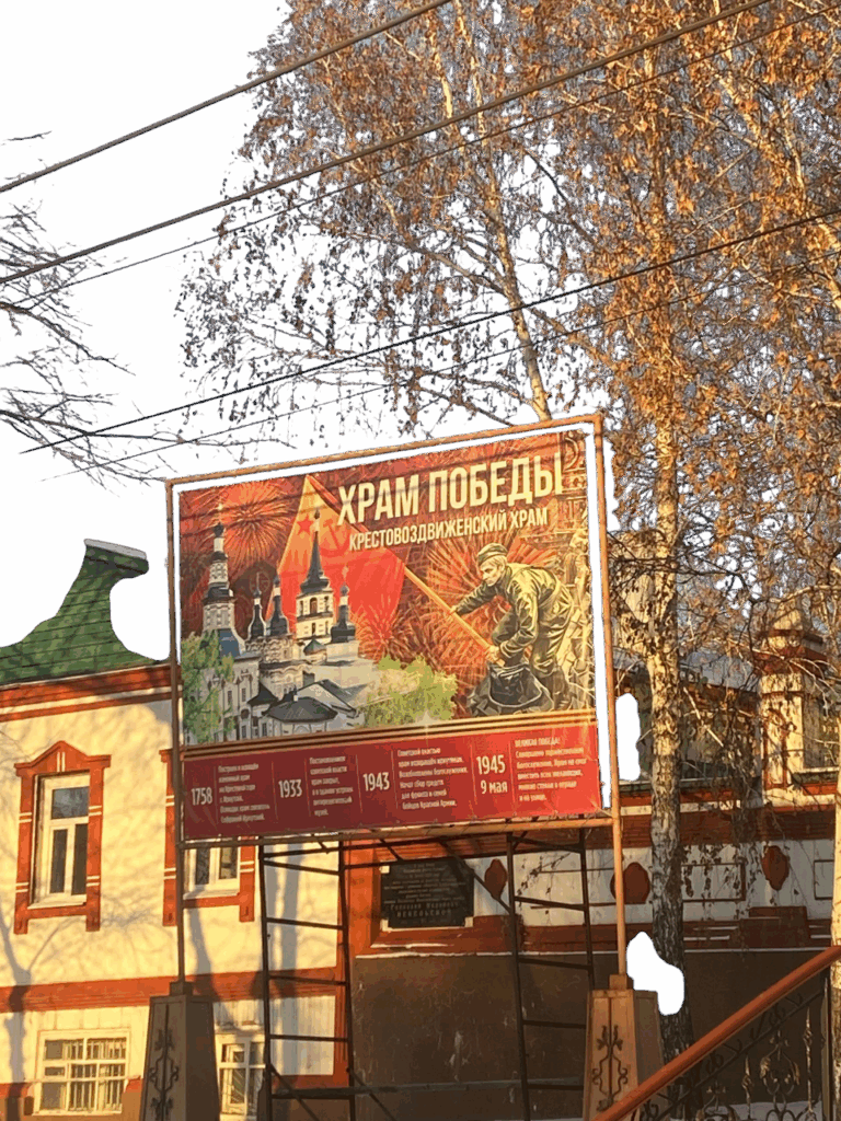 В центре Иркутска у лестницы при входе на территорию Крестовоздвиженской церкви стоит баннер со словами «Храм победы». На нем изображен советский солдат, держащий красный флаг с серпом и молотом.