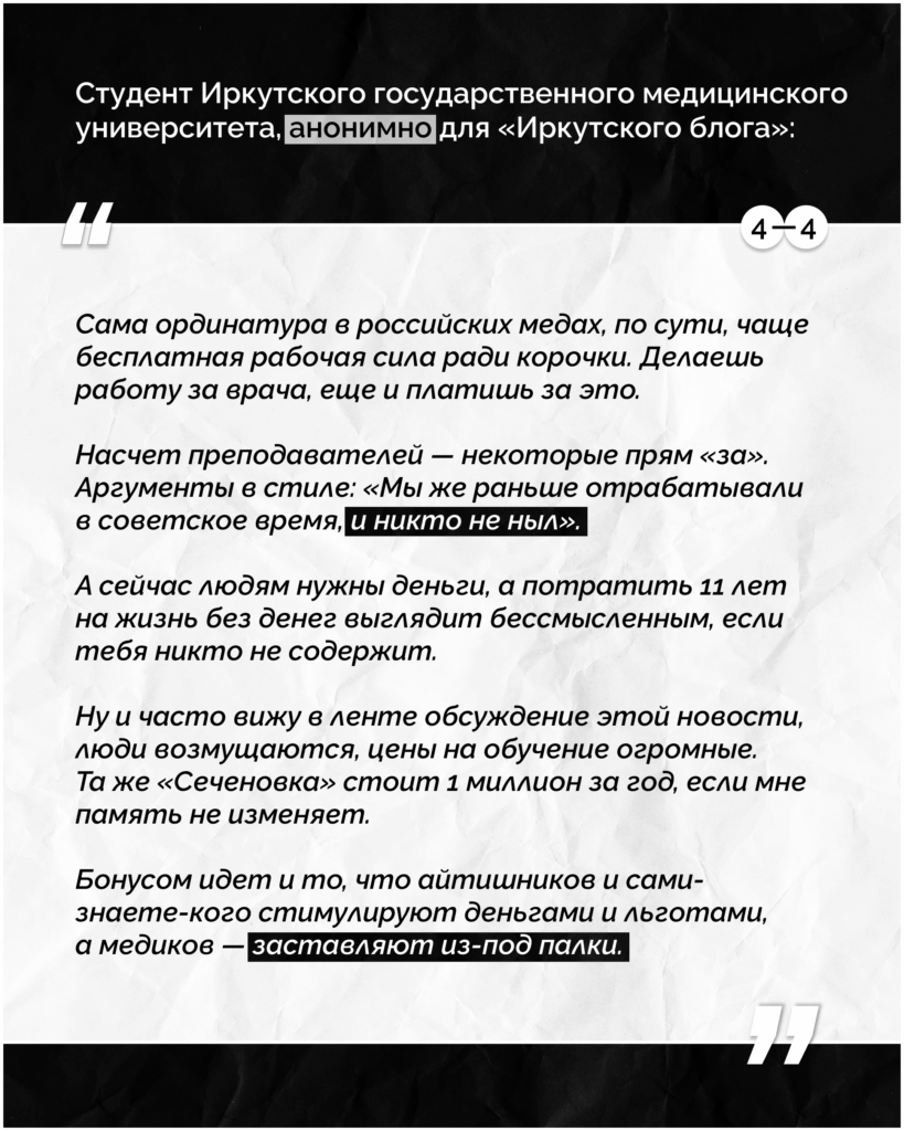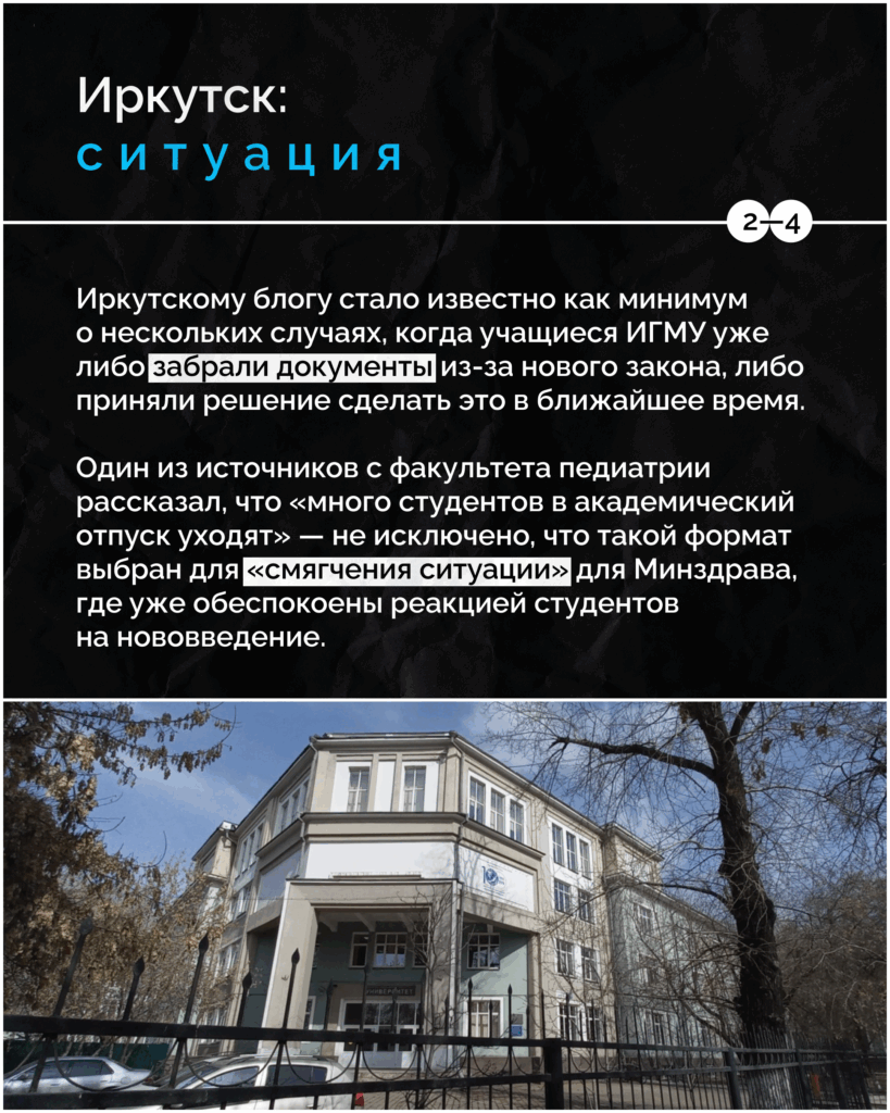 Как пишет «Медицинская Россия», новый закон спровоцировал волну отчислений, в том числе в Иркутскому государственном медицинскому университете. Подробности и анонимное мнение студента ИГМУ о происходящем — в карточках.