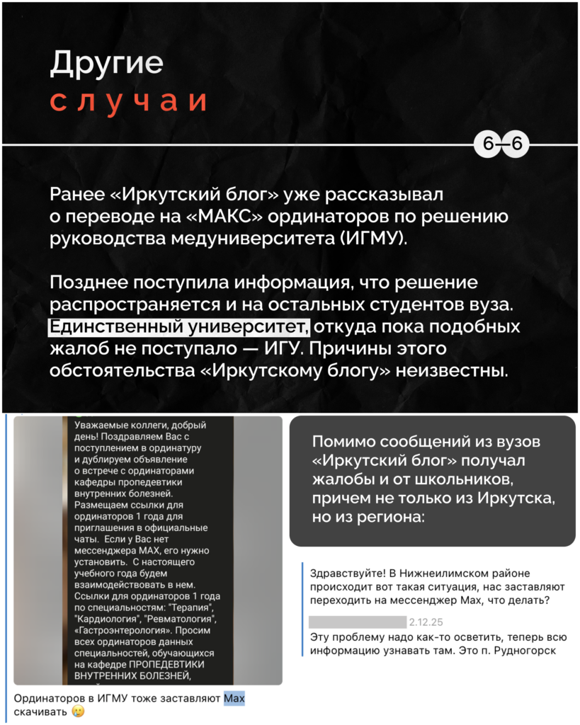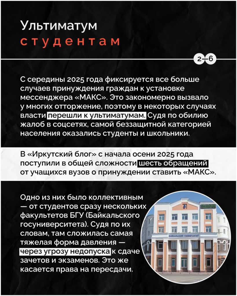Студентов иркутских вузов принуждают ставить мессенджер MAX под угрозой недопуска к зачетам, экзаменам и пересдачам — об этом сами учащиеся рассказали «Иркутскому блогу».