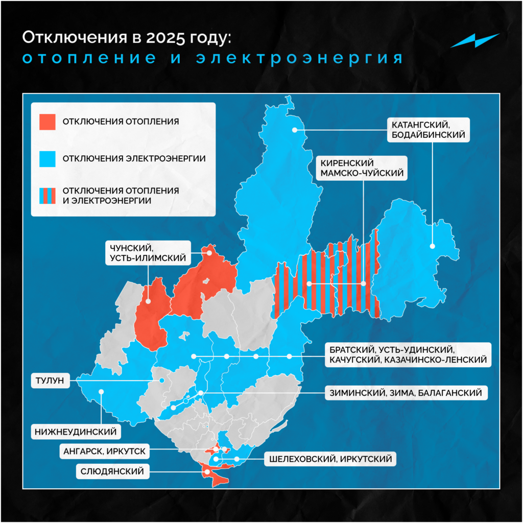 Аварийные отключения отопления и электричества в Иркутской области в 2025 году: масштабы на карте региона.