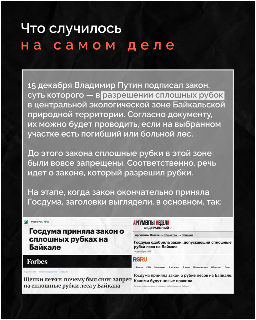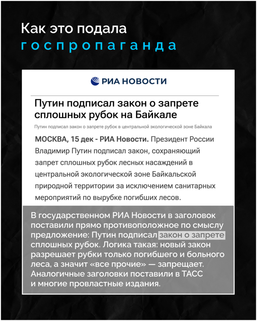 15 декабря президент Владимир Путин подписал закон, разрешающий сплошные рубки лесов Байкала. Однако если обыватель прочтет государственные СМИ, то у него сложится обратное впечатление, ведь в заголовки государственных СМИ заложен прямо противоположный посыл.