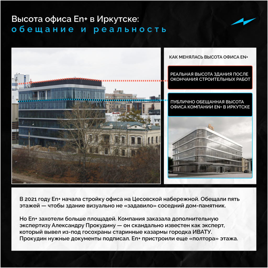 В Иркутске на Цесовской набережной достроили новый офис En+ Олега Дерипаски — и он оказался значительно выше, чем изначально обещали представители компании в СМИ.