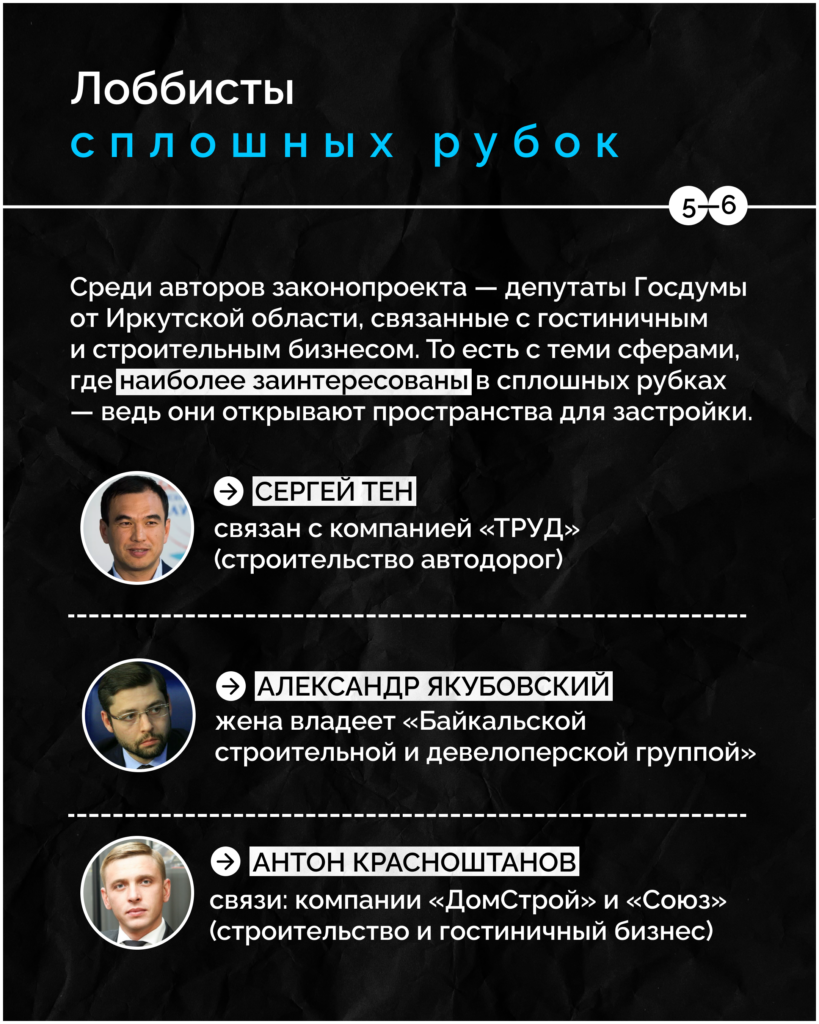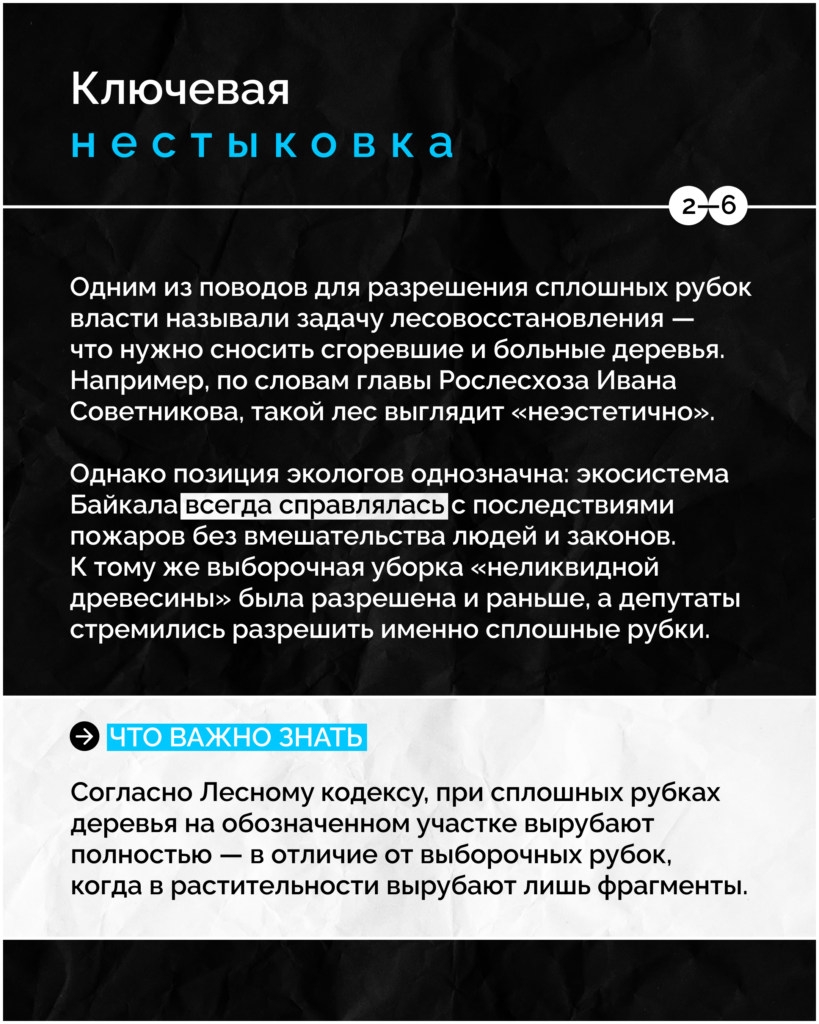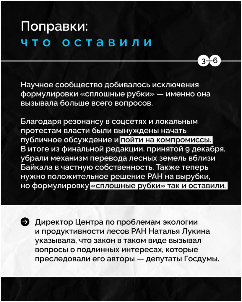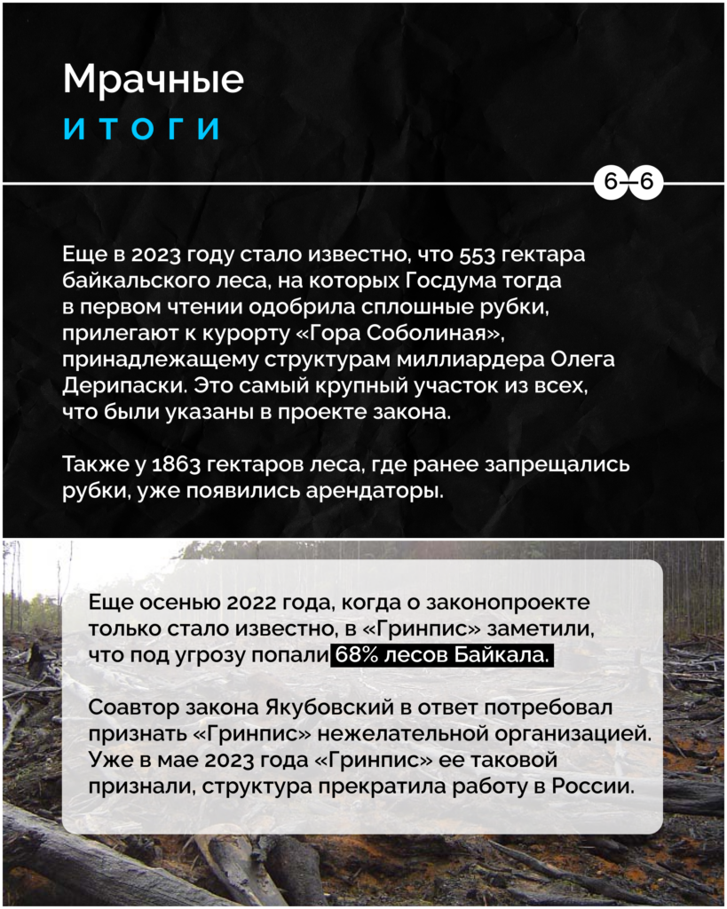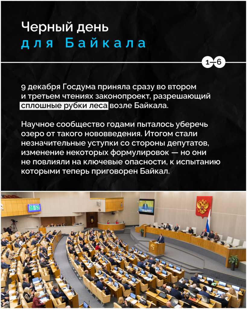 На этой неделе Госдума сразу во втором и окончательном третьем чтении приняла законопроект, разрешающие сплошные рубки байкальских лесов. Подробнее — в карточках.