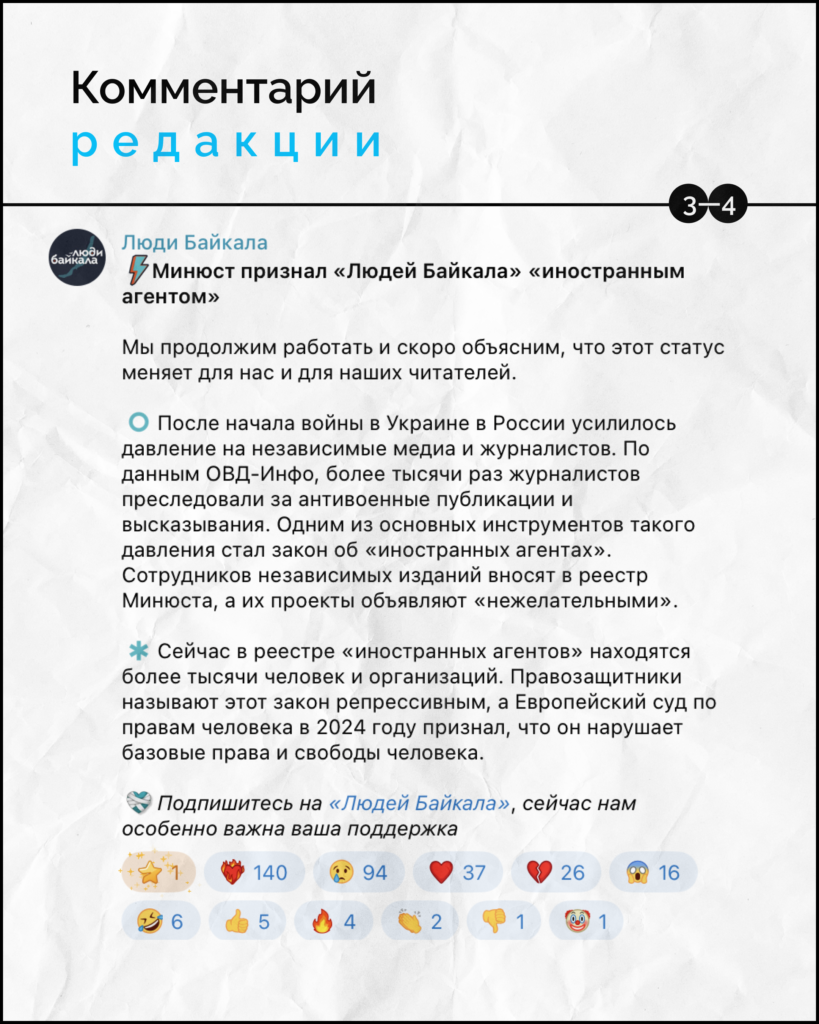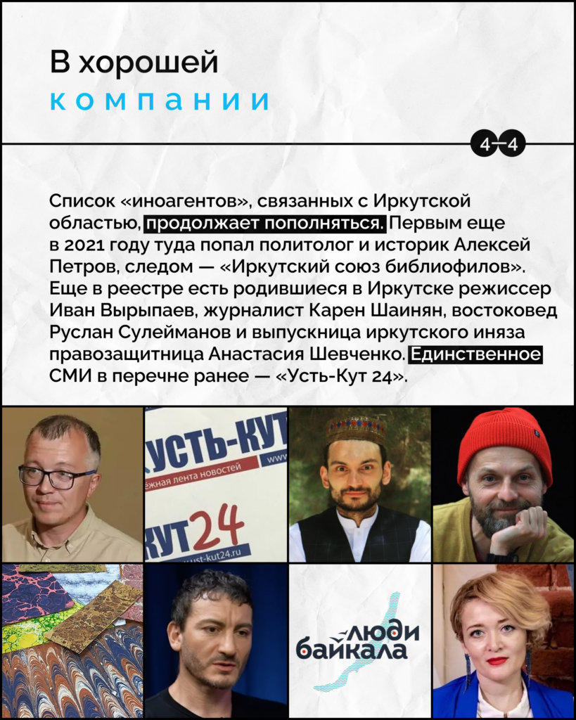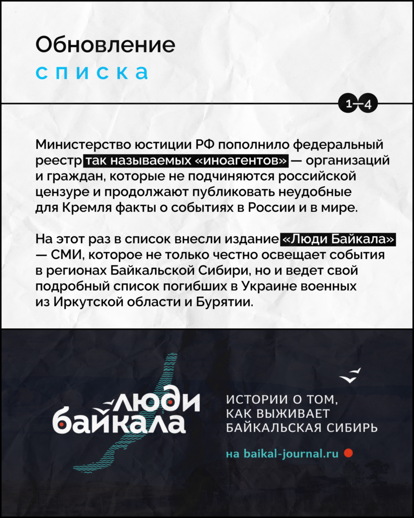 Российский Минюст внес в список так называемых «иностранных агентов» медиапроект «Люди Байкала» — независимое издание, которое пишет о событиях в регионах Байкальской Сибири и ведет подсчет погибших военных из Иркутской области и Бурятии. Подробности — в карточках.