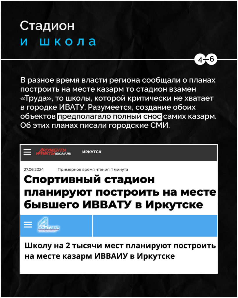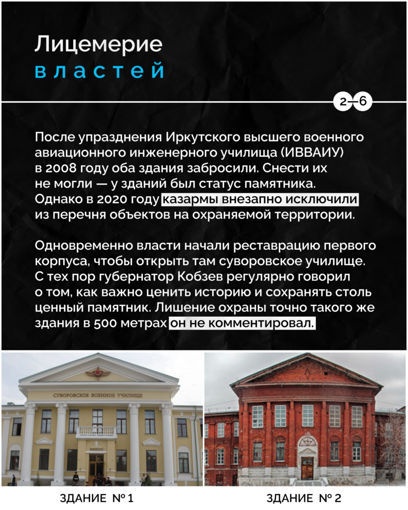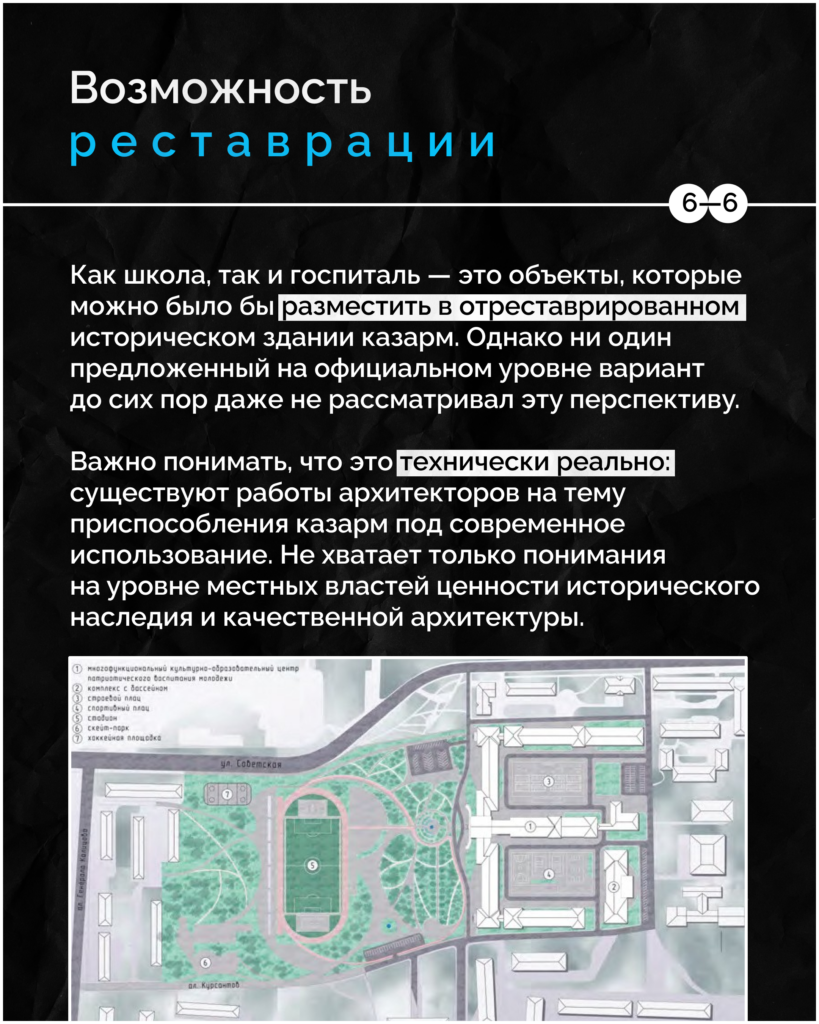 Памятник вывели из-под охраны еще в 2020 году, после чего в его бывшей охранной началось строительство ЖК «Авиатор». Сейчас эти новостройки уже сданы, но власти продолжают продвигать проекты, связанные со сносом казарм, игнорируя идею их реставрации. Подробнее — в карточках.