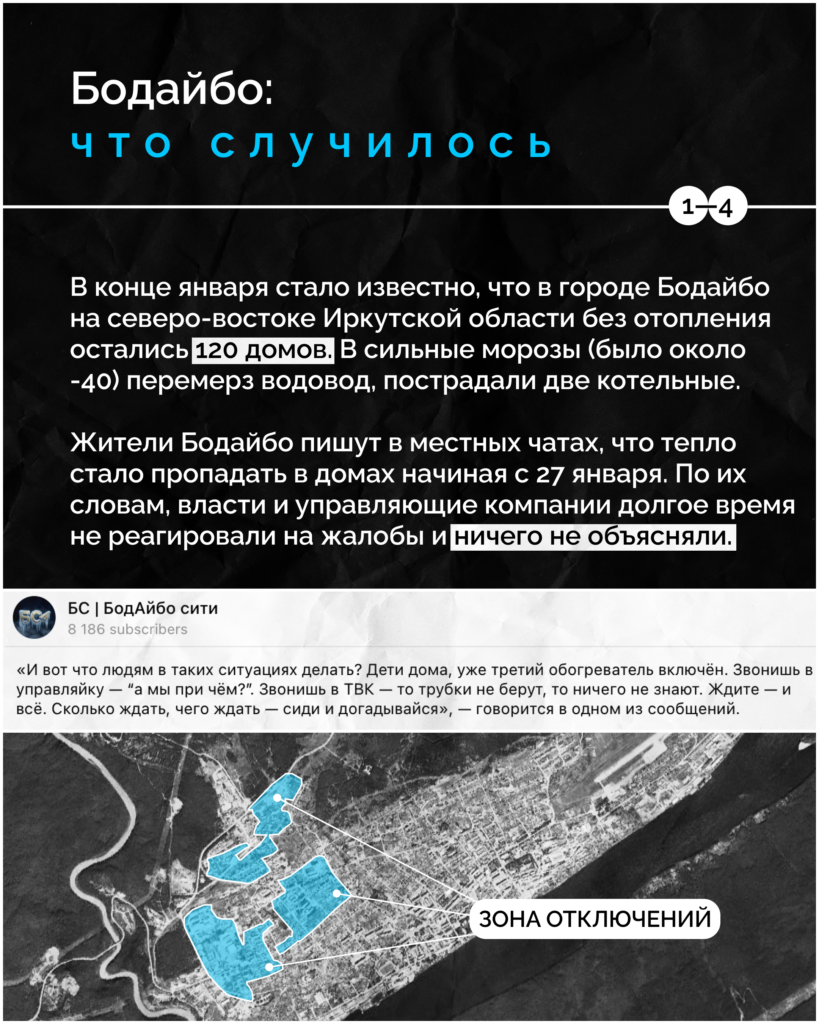 Город Бодайбо в Иркутской области замерзает. Часть города не имеет ни водоснабжения, ни отопления. Проблема остается нерешенной уже больше недели. Подробности — в карточках: