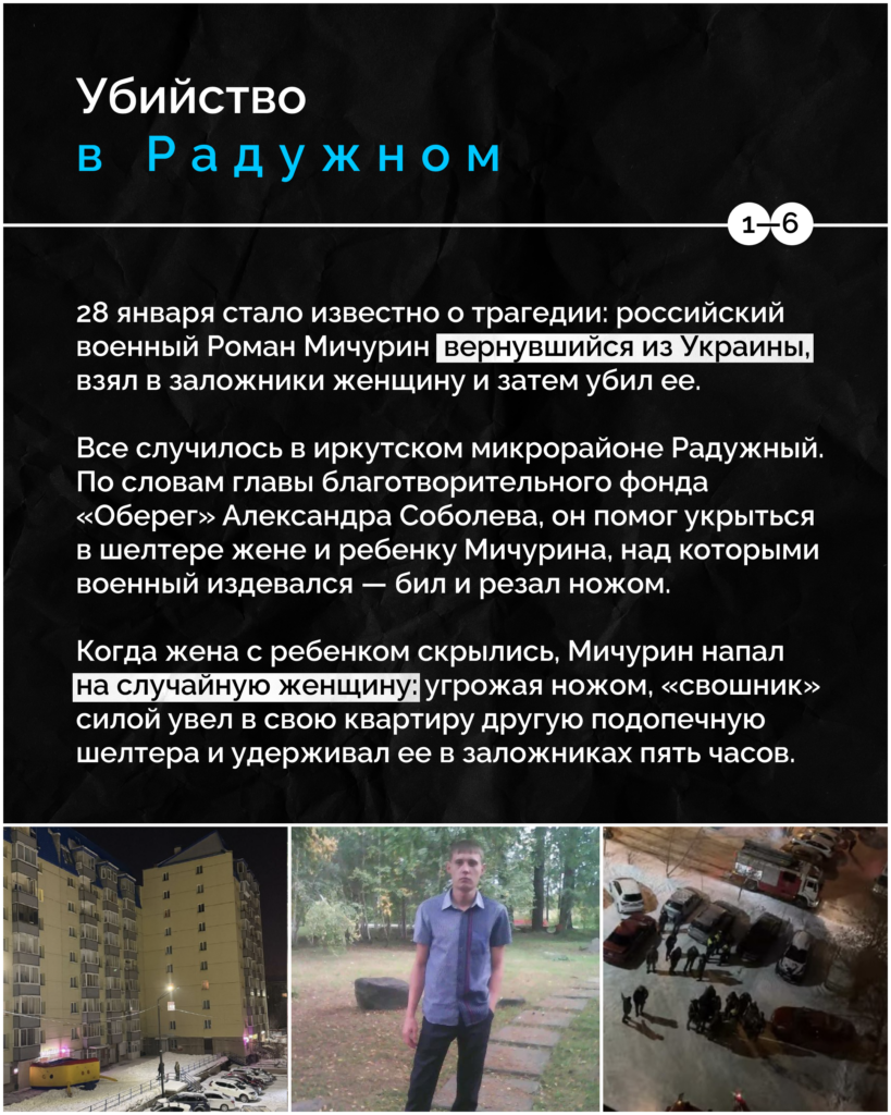 «Иркутский блог» проверил, как иркутские медиа отреагировали на убийство женщины в микрорайоне Радужный, которое совершил Роман Мичурин — военный, вернувшийся из Украины. Подробности — в карточках.